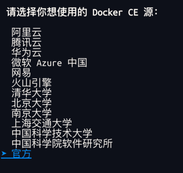 bash <(curl -sSL https://linuxmirrors.cn/docker.sh)执行后会让你选择两次安装源,使用键盘上的“↑”、“↓”箭头调整选项,然后回车执行安装。
