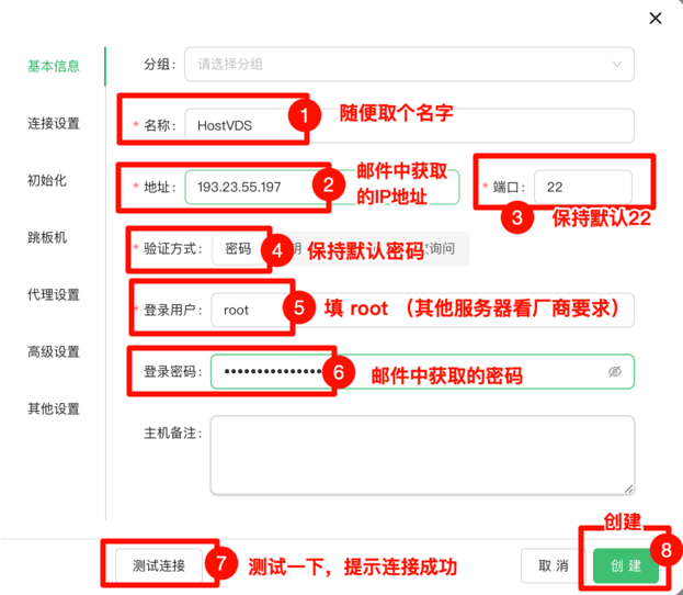 root(其他服务器厂商可能不同,具体看厂商的要求); - 登录密码:填写你的服务器的