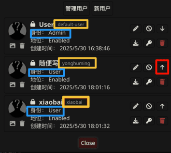 ↑是设置为管理员,↓是设置为普通用户。(不要更改 default-user 的身份)