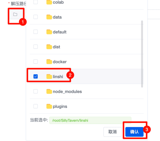 在打开的右侧窗口中,点击 解压路径下面的 小文件夹图标 ,勾选刚刚创建的 linshi 文件夹,然后点 确认