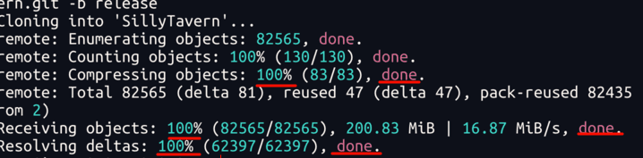 git clone https://github.com/SillyTavern/SillyTavern.git -b release耐心等待文件下载完成,如图所示就是完成了。(关注 100% 和 done 字符,而不是关注数字),例如: