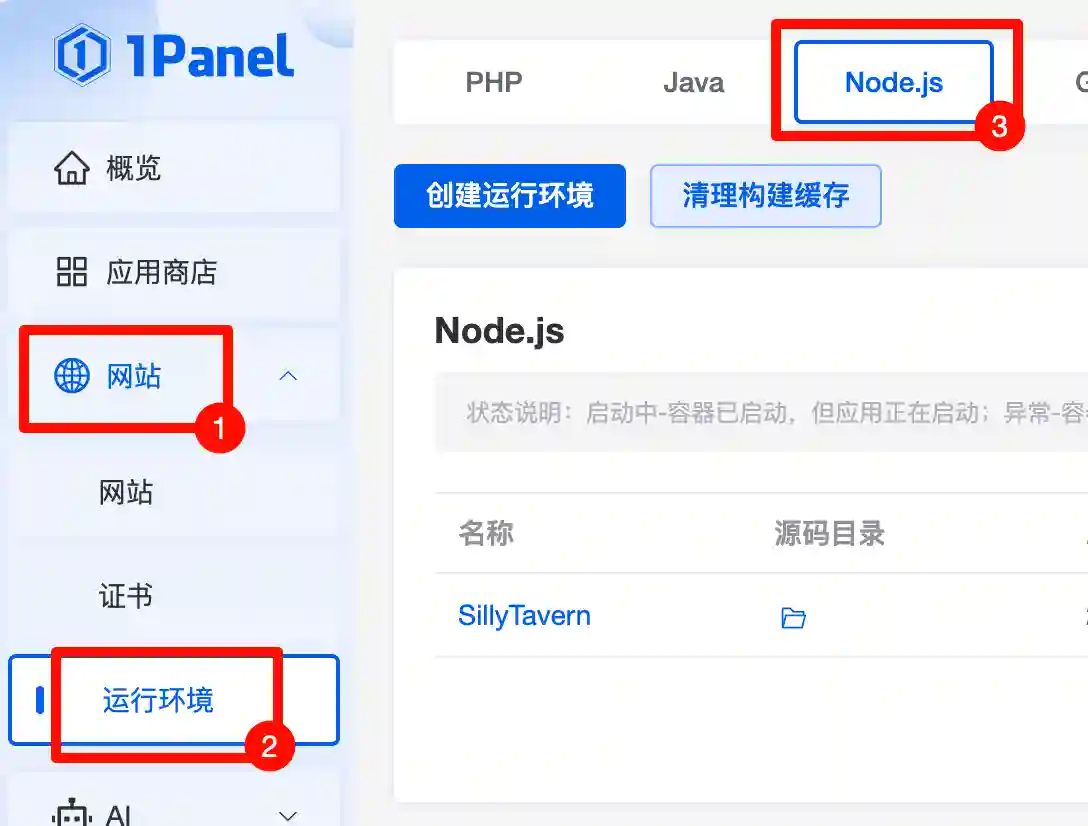 ② 找到你的 网站 → 运行环境 → Node.js,已经可以看到你的酒馆项目了