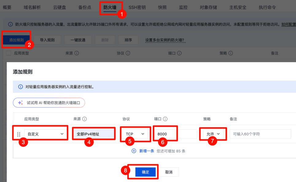 建议多次设置,分别放行:8000(酒馆)、10086(我自定义的 1Panel 端口)等等